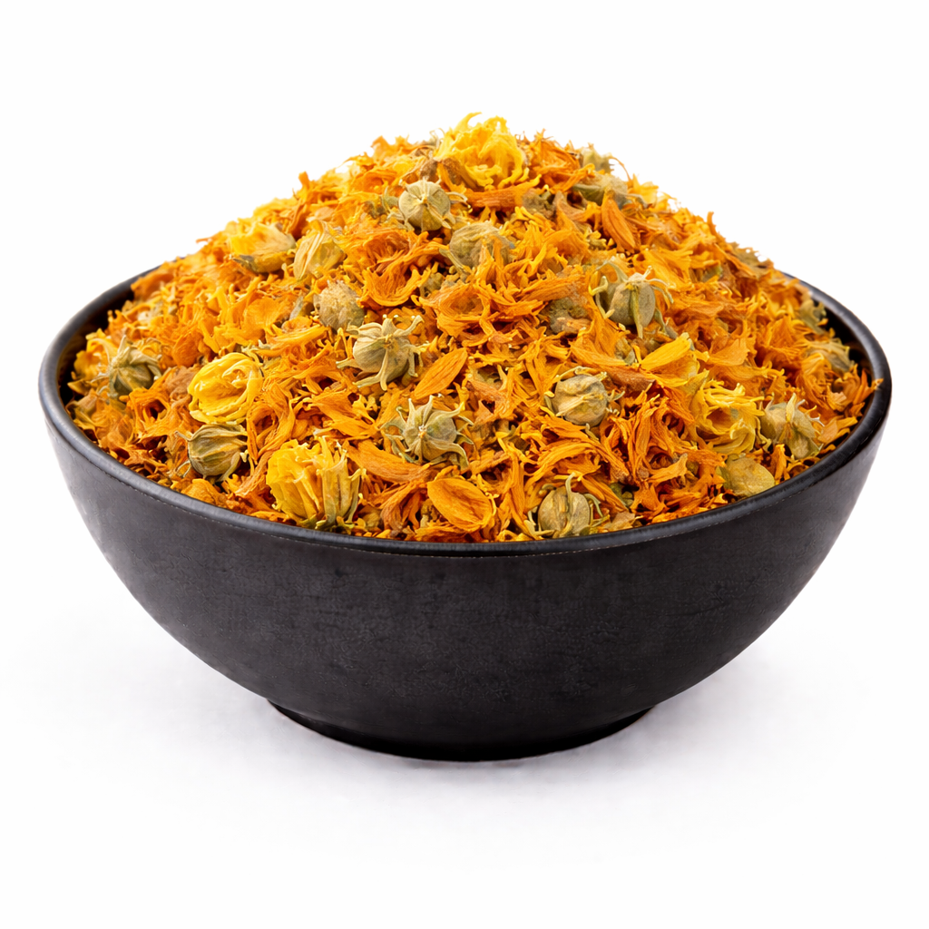 Marigold Flowers (Dried) consist of carefully harvested and preserved petals known for their bright golden-orange colour and traditional use in botanical preparations. Widely valued in skincare and herbal formulations, marigold is appreciated for its soothing properties and natural vibrancy. It is commonly incorporated into teas, infused oils, balms, and decorative artisan products.